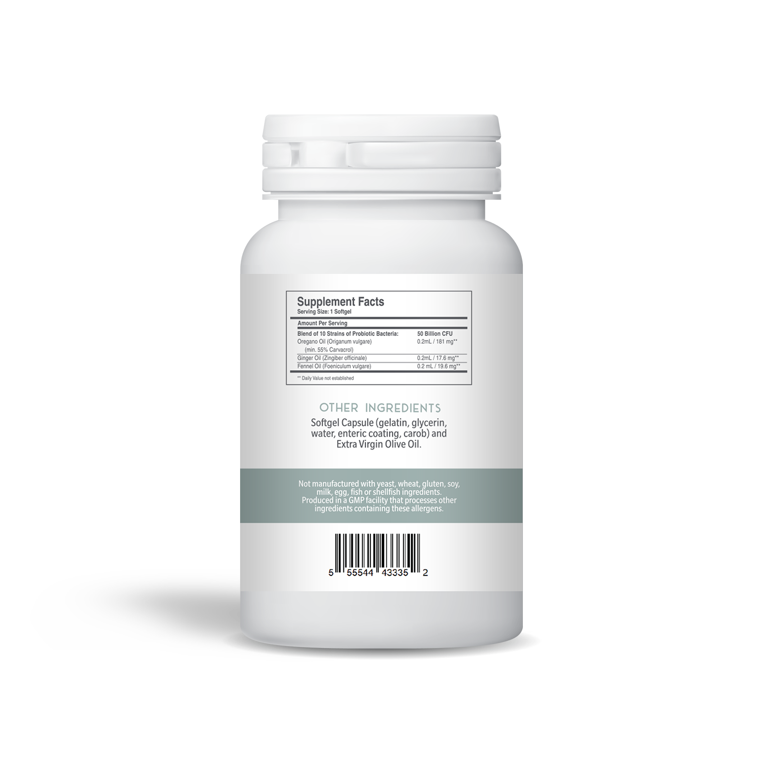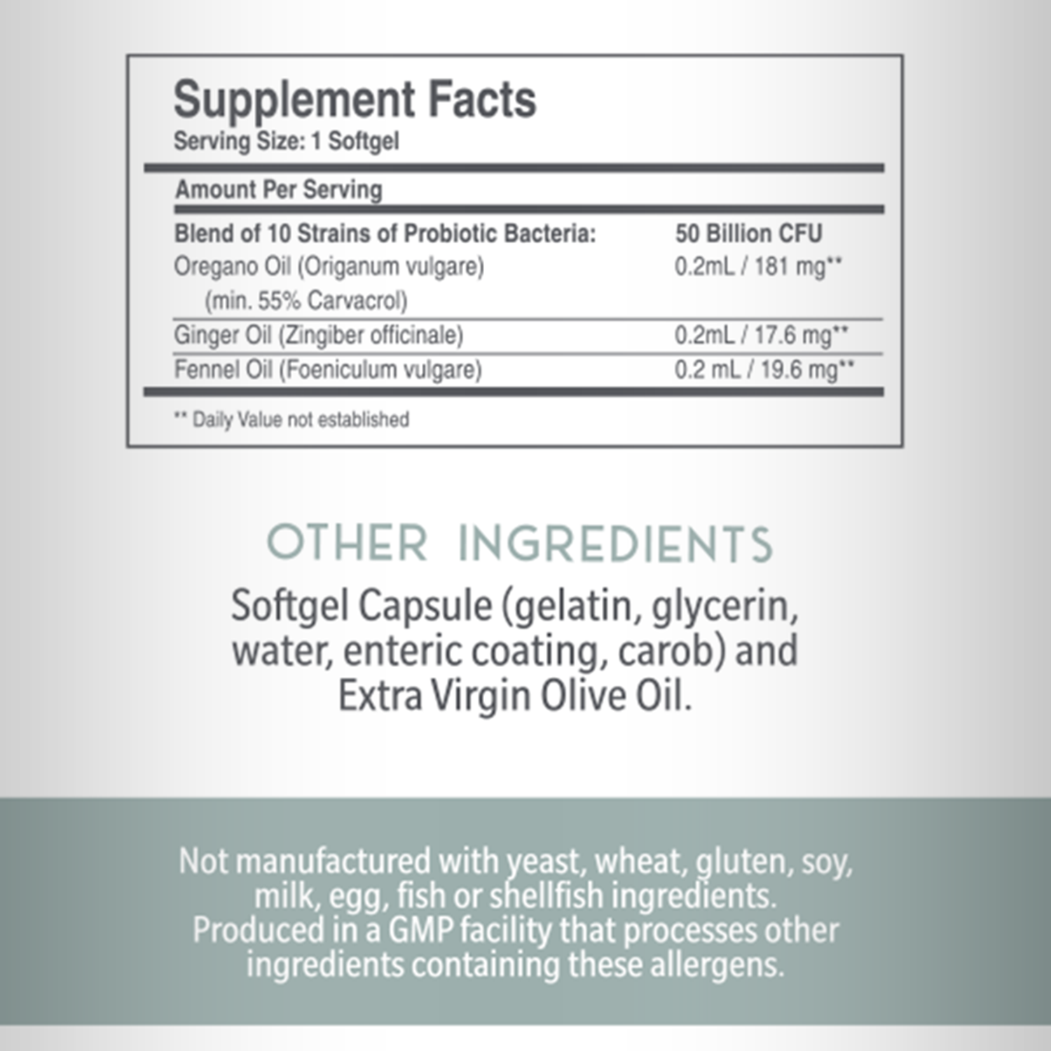 Ingredients: Oregano Oil (Origanum vulgare) 181 mg, Ginger Oil 17.6 mg, Fennel Oil 19.3 mg Other ingredients: Softgel Capsule (gelatin, glycerin, water, enteric coating, carob) and Extra Virgin Olive Oil.